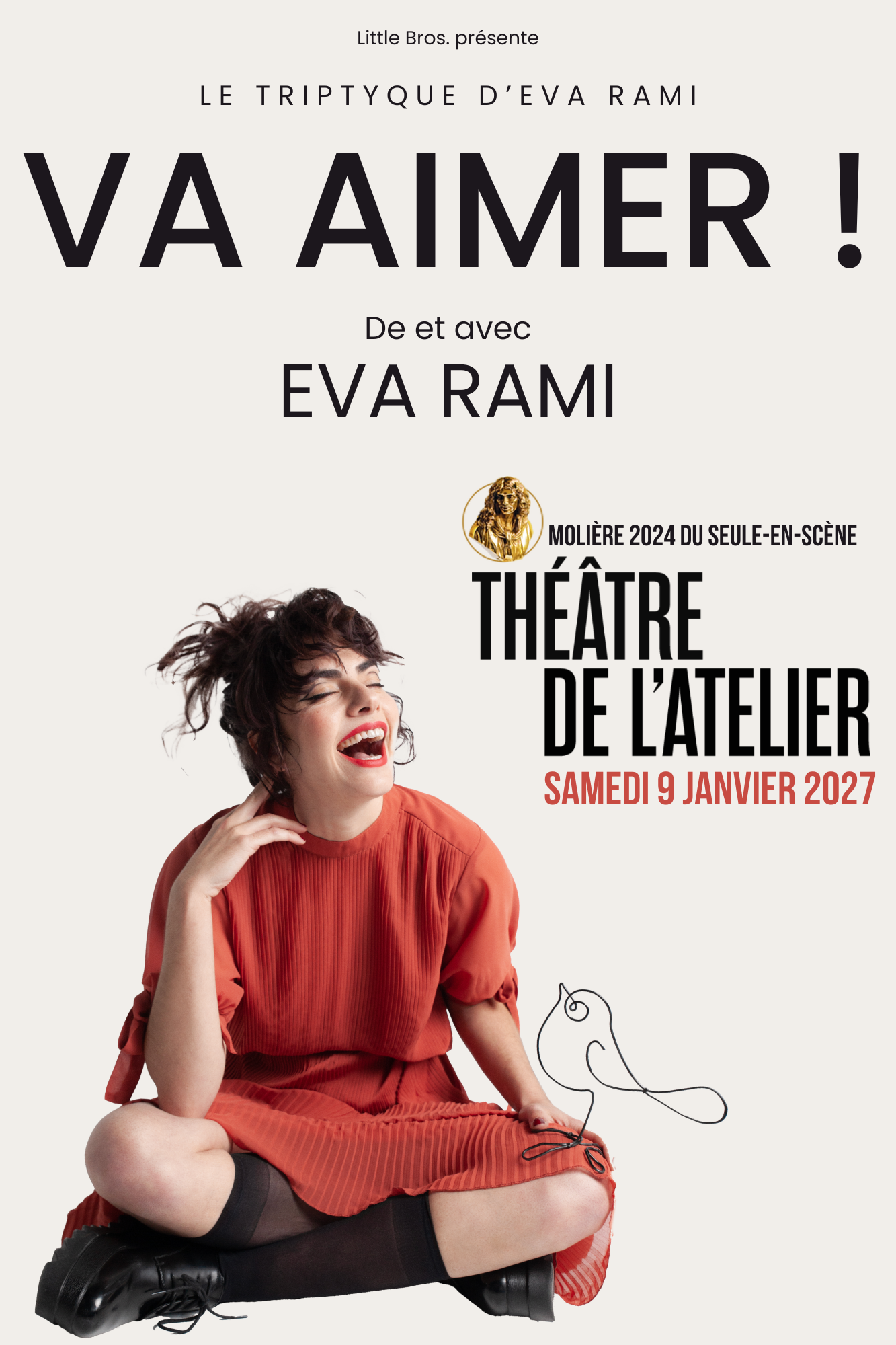 Ce triptyque, composé de « VOLE ! », « T’ES TOI ! » et « VA AIMER ! », retrace le parcours d’une femme en quête d’identité, naviguant entre ses racines, ses aspirations et les injonctions sociales. Des spectacles à la fois tendre et incisif, où Eva Rami incarne une galerie de personnages hauts en couleur, donnant vie à une histoire à laquelle chacun peut s’identifier.