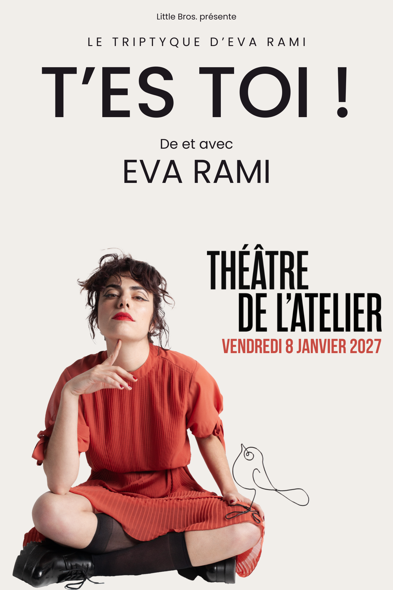 Dans ce second volet qui s’intitule « T’ES TOI ! », on retrouve le personnage d’Elsa, confrontée au regard familial et à celui de son milieu professionnel. À travers les différents personnages qu’elle interprète, tour à tour « attachiants », fantasques, mégalos, horripilants, la comédienne nous confie ses difficultés pour trouver sa place, s’imposer et faire des choix de vie. Loin de réduire son propos à l’univers du théâtre, Eva Rami nous embarque dans un monde qui nous est familier et auquel chacun d’entre nous peut s’identifier.